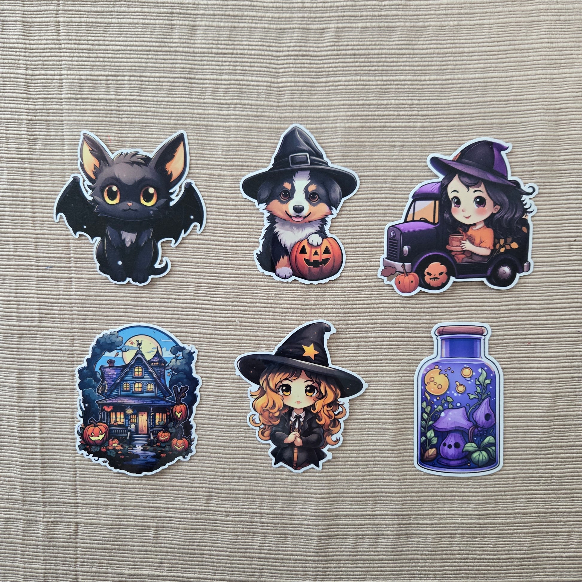 Celebrate Halloween with this vibrant set of 6 adorable and fun stickers. Each 3-inch sticker is laminated and water-resistant, perfect for sticking on plastic, metal, glass, or any smooth surface. Ideal for jazzing up your laptop, water bottle, or notebook, these stickers bring a playful spooky touch. Collect a few to swap with friends or decorate your favorite items, sharing your festive spirit all around. Enjoy the quirky and spooky designs that add a delightful Halloween twist!