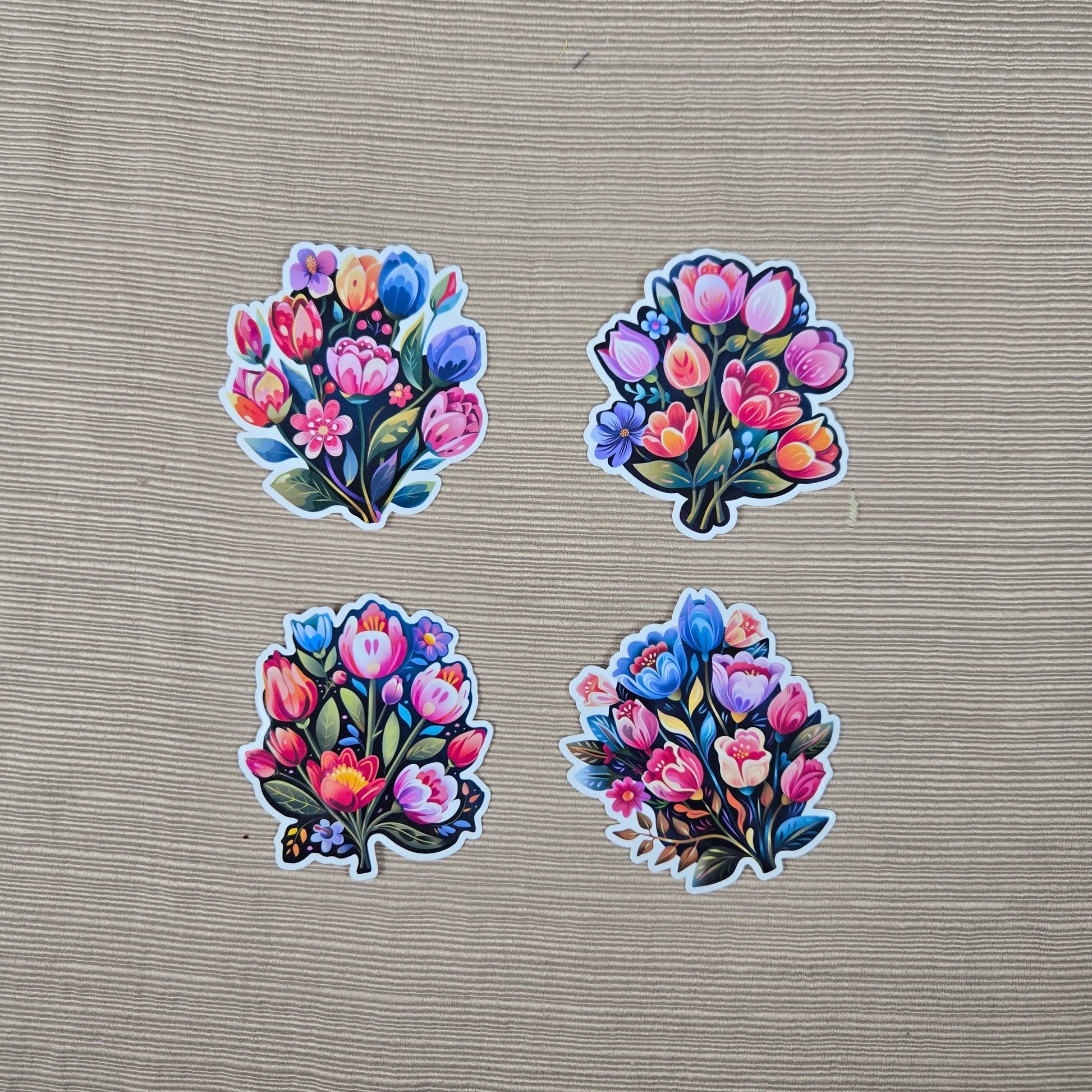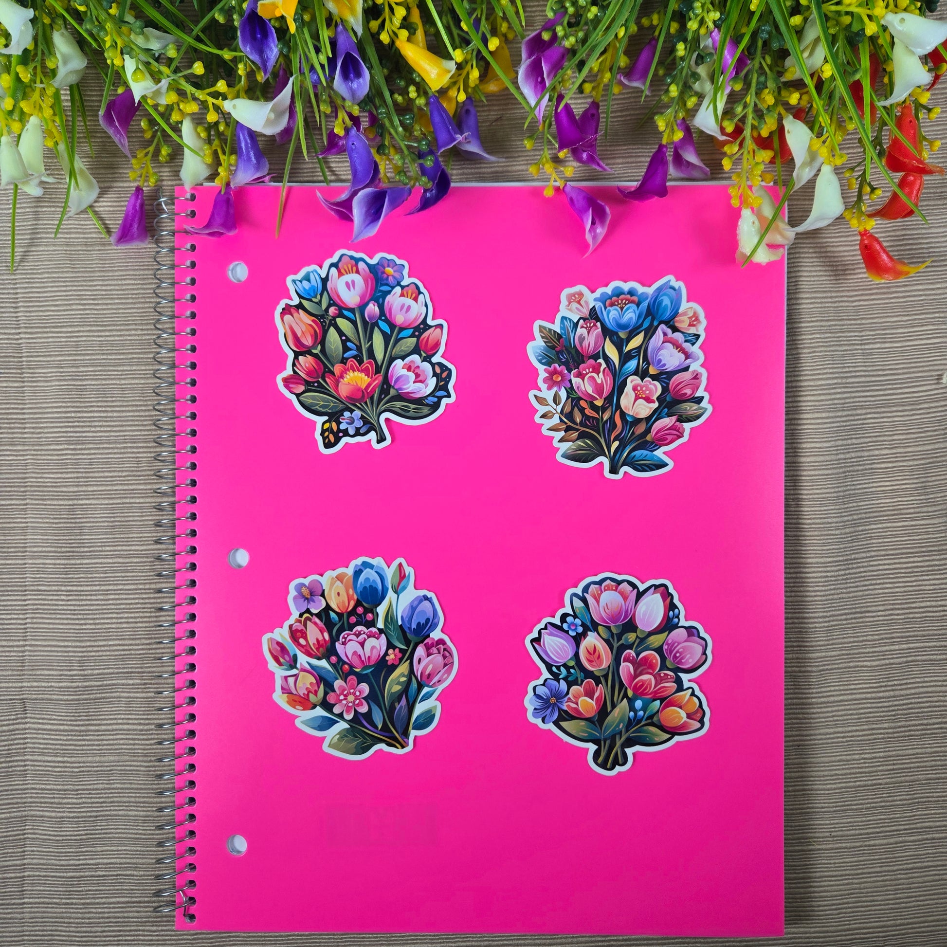 Brighten your day with this elegant set of 4 exquisite flower bouquet stickers. Each 3-inch sticker features a laminated, water-resistant finish, making them ideal for personalizing plastic, metal, glass, or other smooth surfaces. Perfect for adding a refined and vibrant accent to your laptop, water bottle, or notebook. Collect a few to share with friends or elevate your favorite items with a tasteful burst of floral beauty.