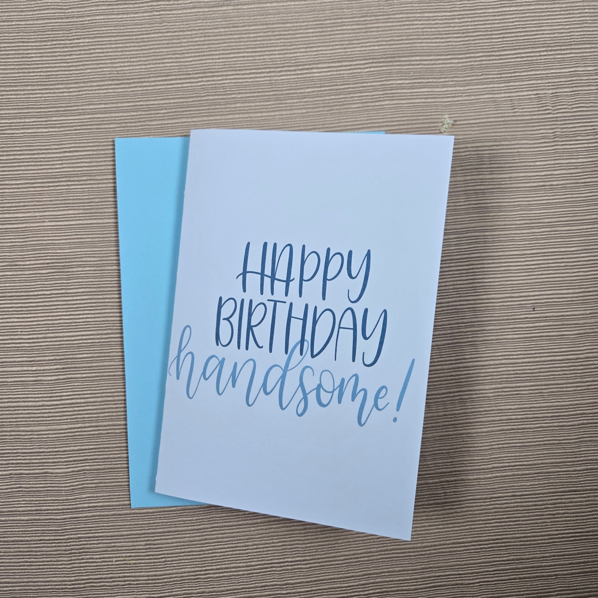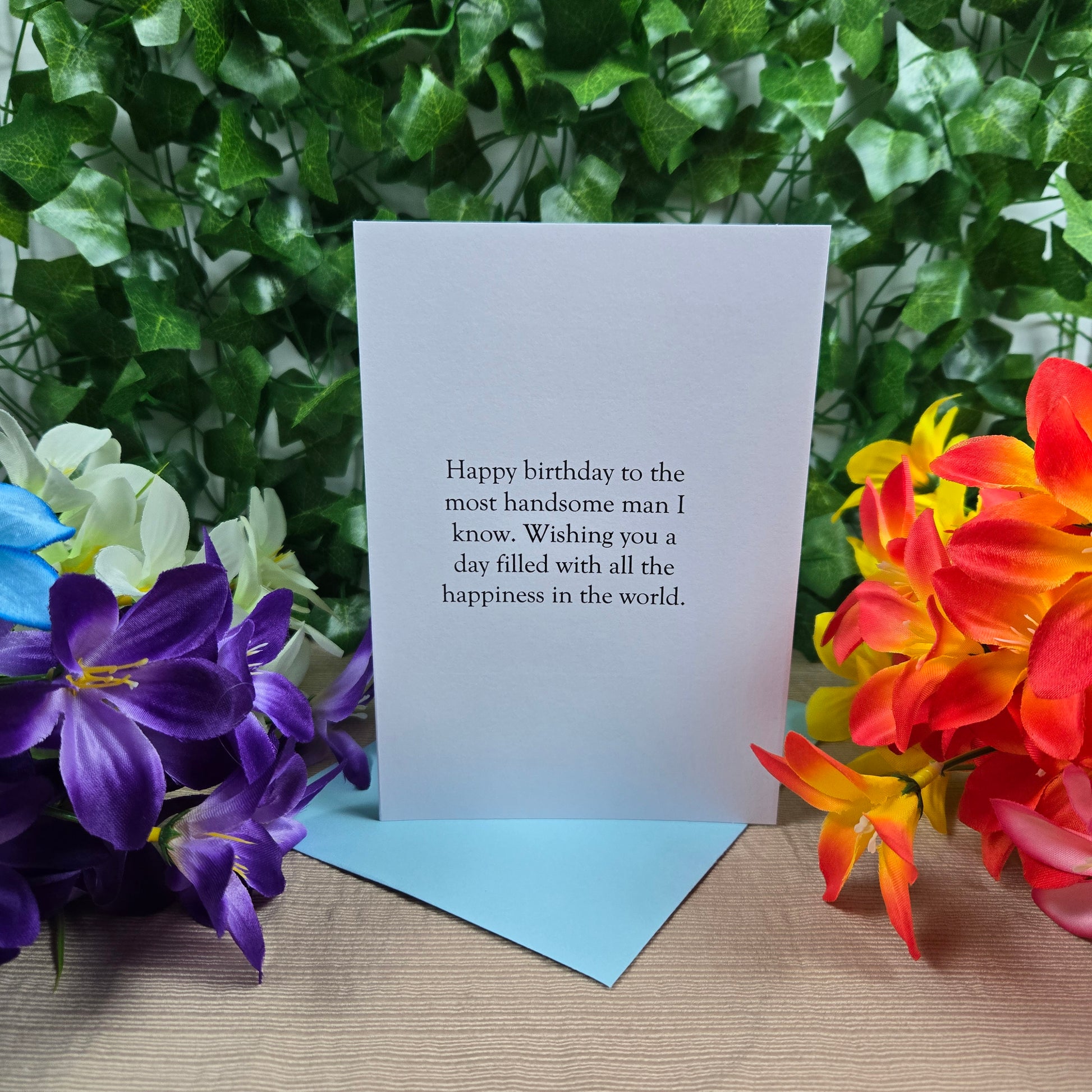 Make his birthday extra special with the 5x7 Happy Birthday Handsome Card, designed to bring a smile and a playful wink. Featuring a fun and lively message already included, this card effortlessly conveys your warm and charming wishes. The light blue envelope adds a fresh, cheerful touch, making it ready to send or gift immediately. Perfect for that confident, charming guy in your life, this card adds a dash of fun and personality to his celebration.