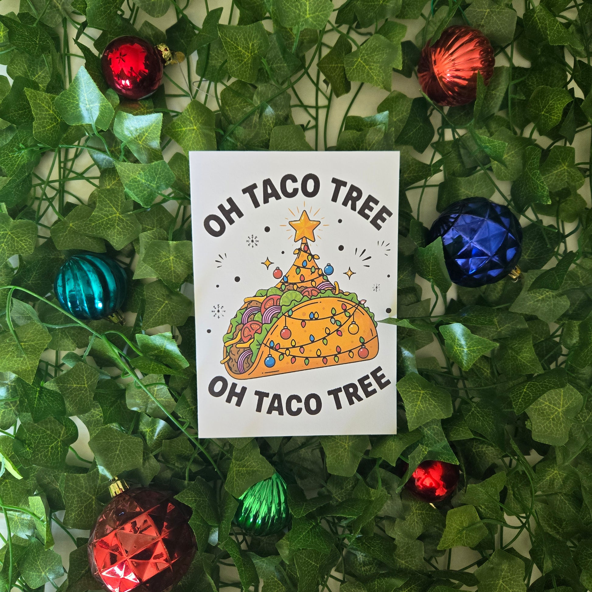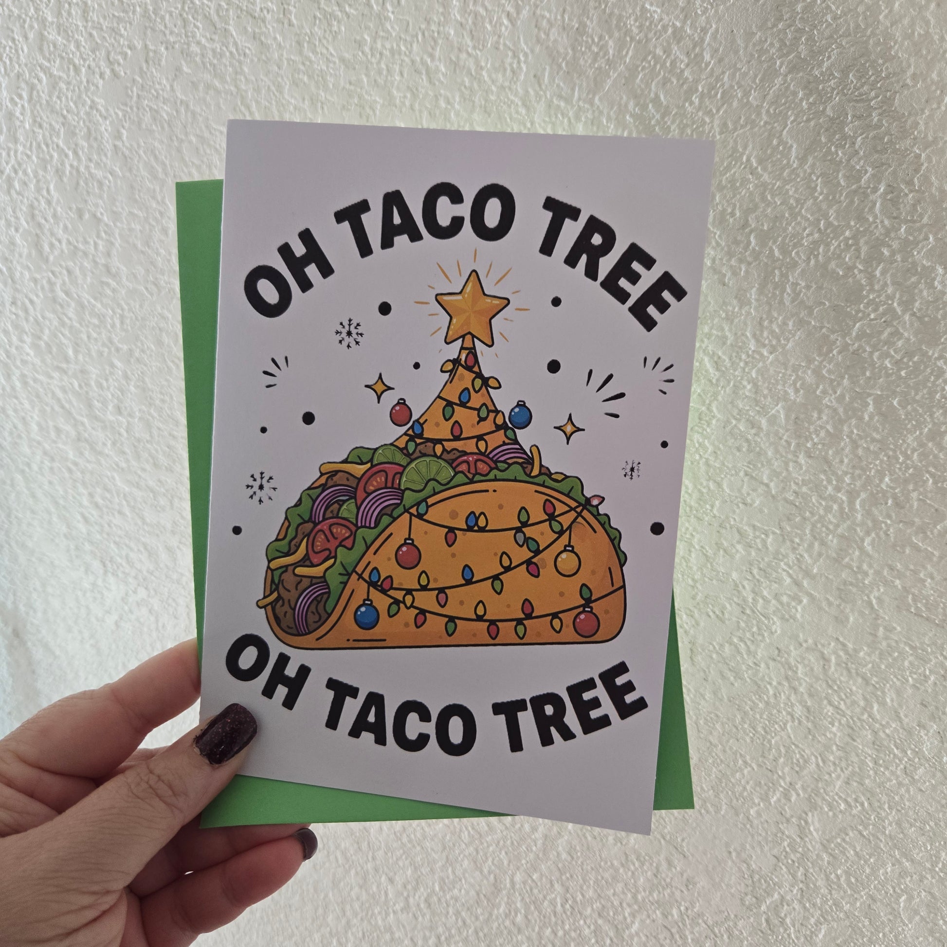 Deck the halls with tacos and twinkle! This charming holiday card features a taco dressed up like a Christmas tree, complete with ornaments and a star on top.