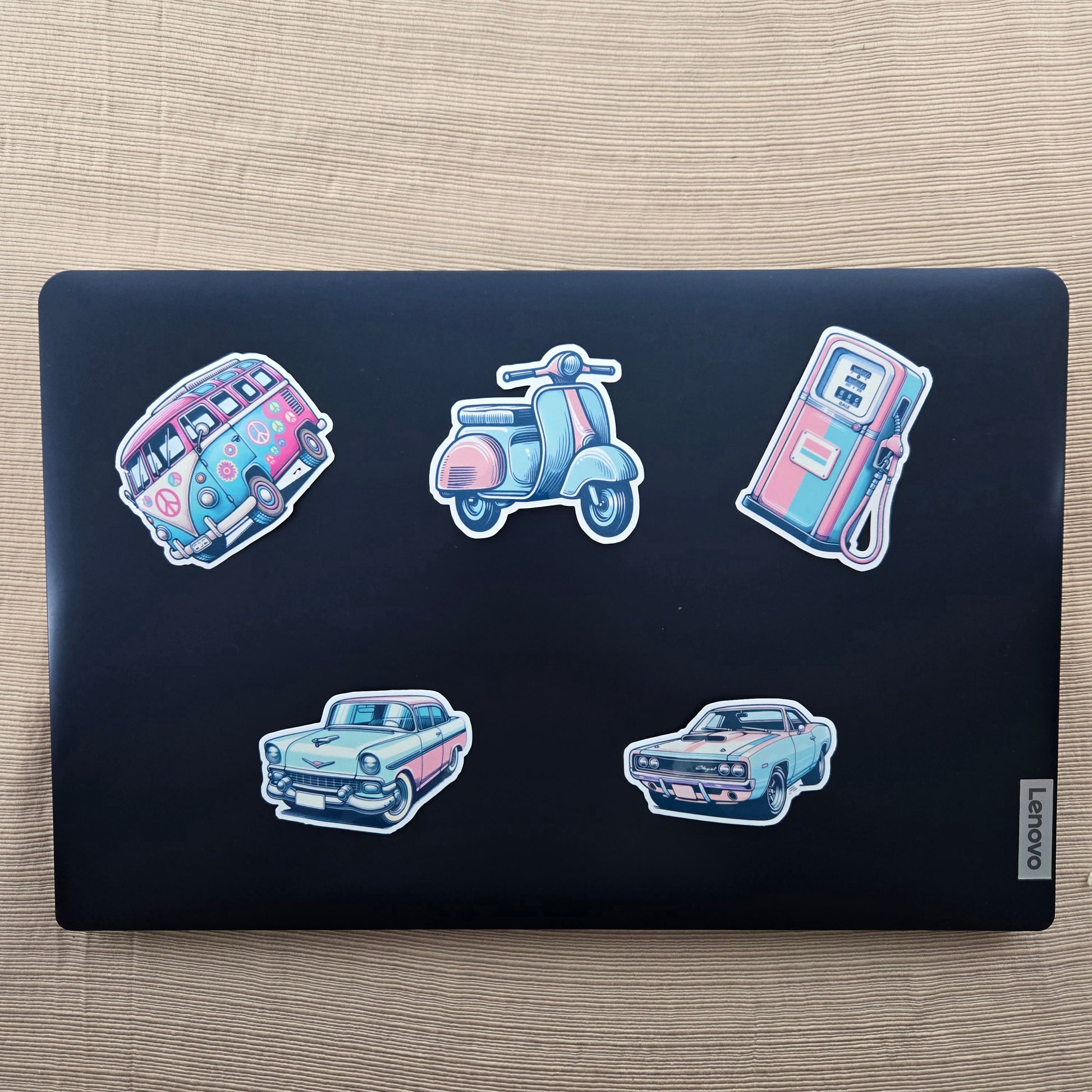 Hit the road with our Retro Vehicle Stickers! This lively set features five distinct, 3-inch designs that celebrate classic cars, motorcycles, and vintage rides with a playful twist. Each sticker is laminated for durability and a glossy finish, perfect for adding a nostalgic charm to your laptop, water bottle, notebook, or any surface that could use some fun. Whether you're a vehicle enthusiast or just love retro style, these stickers bring a cheerful blast from the past to brighten your day and fuel your imagination wherever you stick them. Get ready to cruise in style!