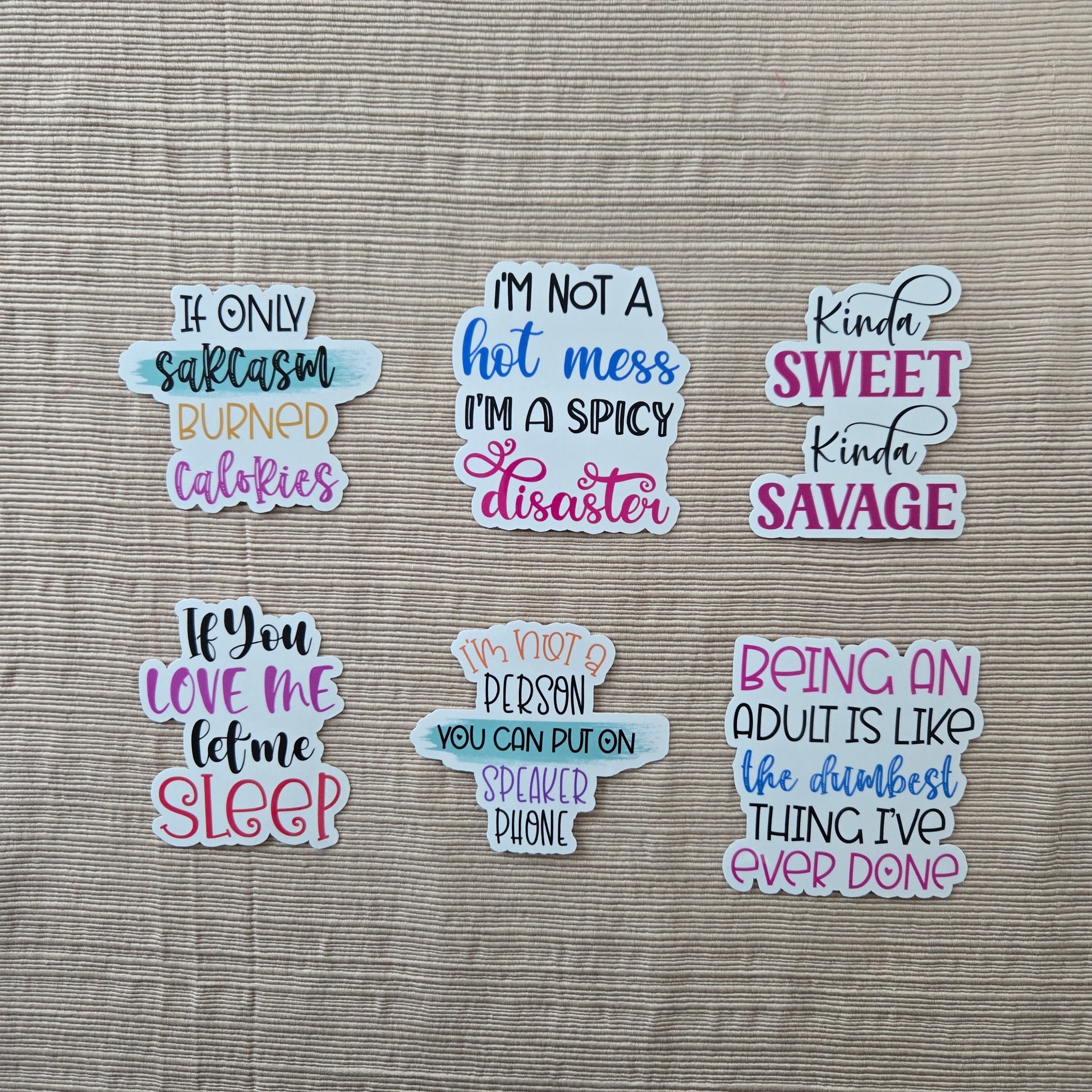Bring a smile to your day with this playful set of 6 sarcastic funny quote stickers. Each 3-inch sticker is laminated and water-resistant, perfect for customizing plastic, metal, glass, or any smooth surface. Great for adding a witty and lively touch to your laptop, water bottle, or notebook. Grab a few to share with friends or spice up your favorite belongings with a splash of colorful sarcasm.